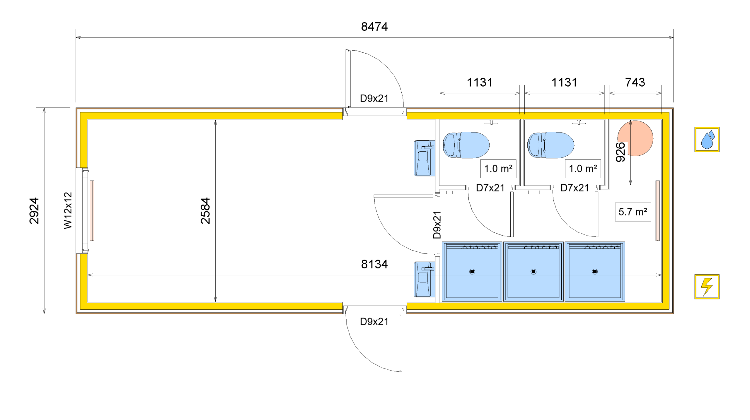 Water & Sewage ConnectionWater pipe Ø26,9 mm, Sewage pipe Ø110 mm