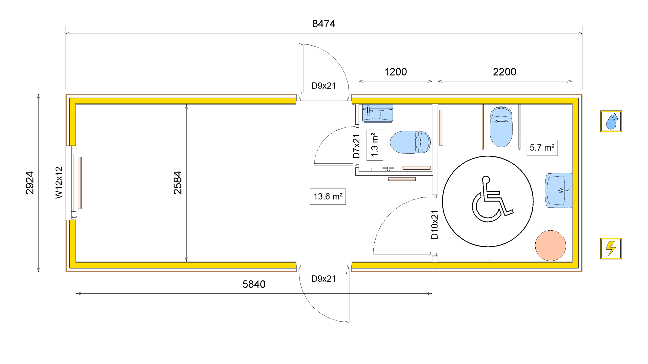 Water & Sewage ConnectionWater pipe Ø26,9 mm, Sewage pipe Ø110 mm